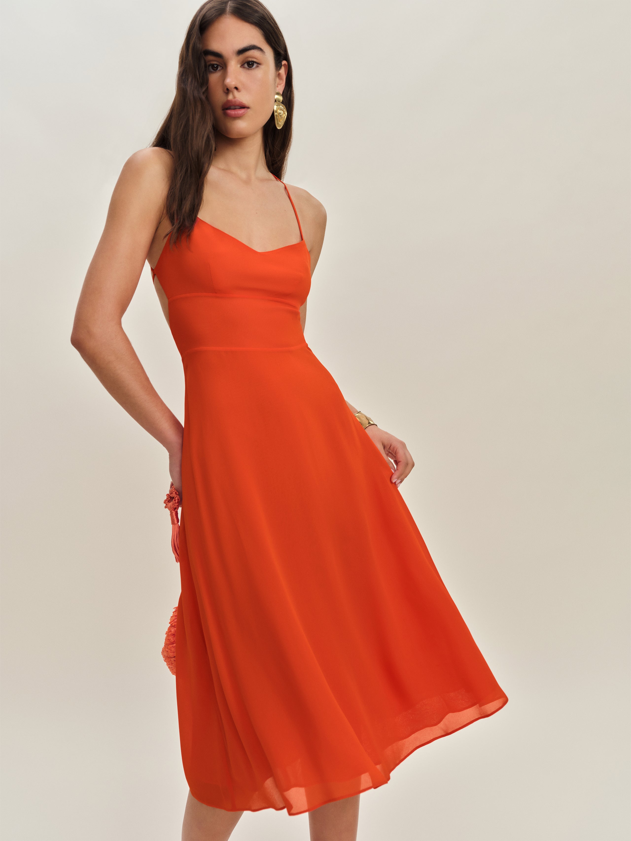 Wear the dress. Shop the Suzy Dress from Reformation, a sleeveless midi dress with a sweetheart neckline and open back.