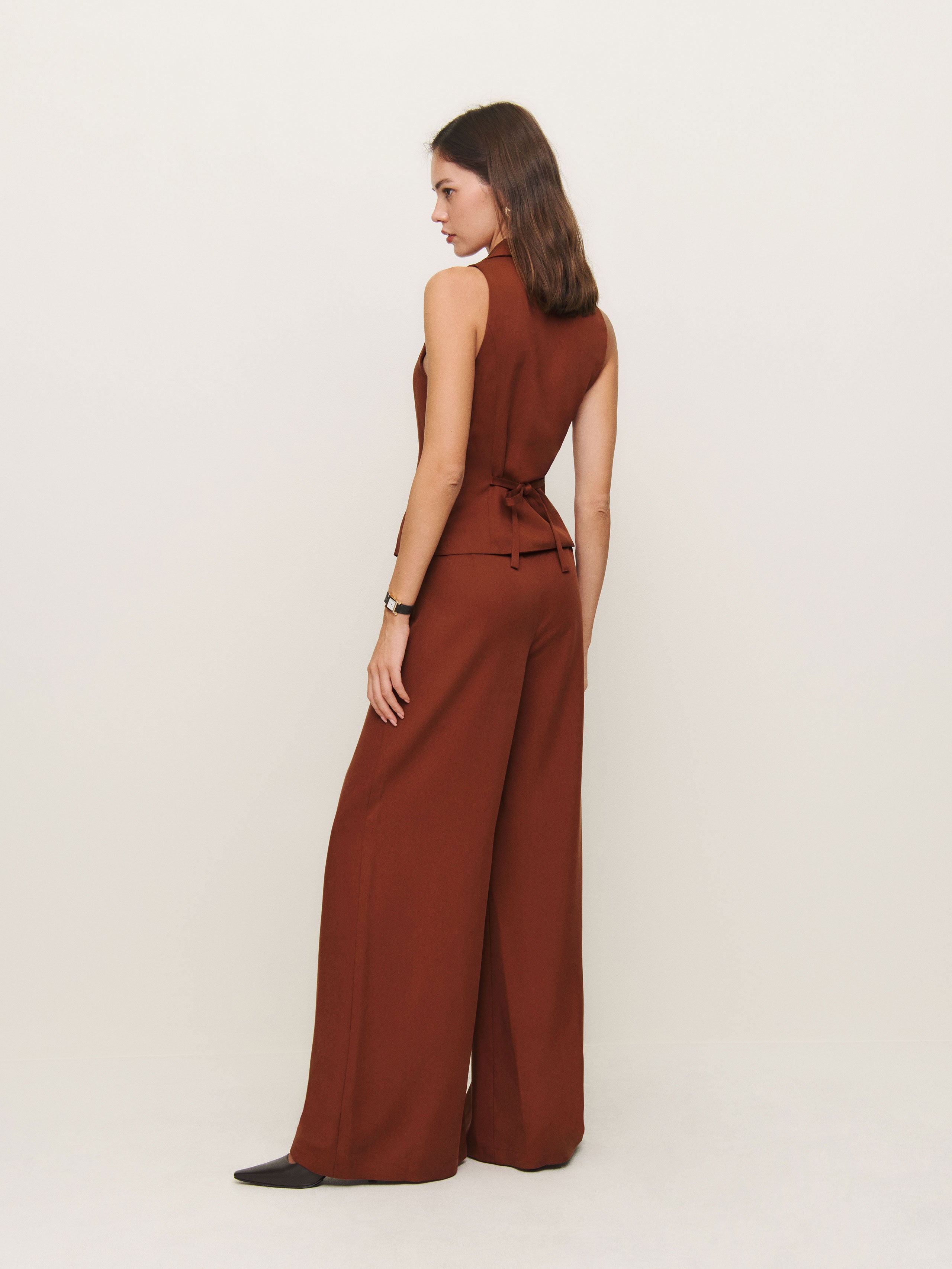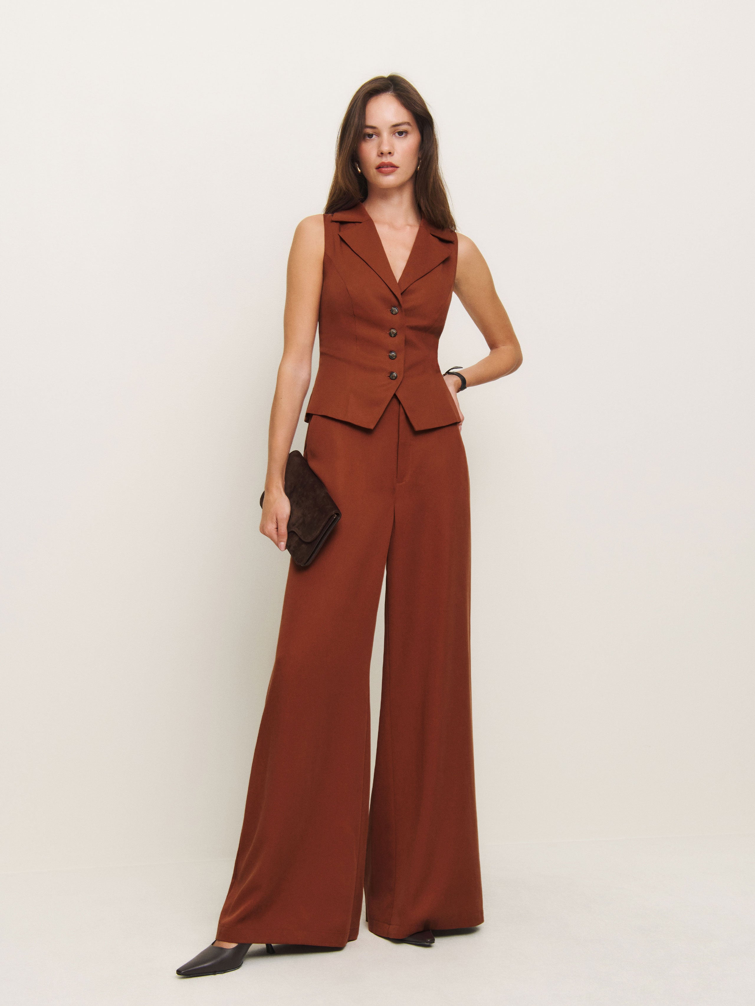 Package deal. Shop the Taryn Two Piece from Reformation, a two piece set with a sleeveless vest top with center front buttons and a wide leg pant.