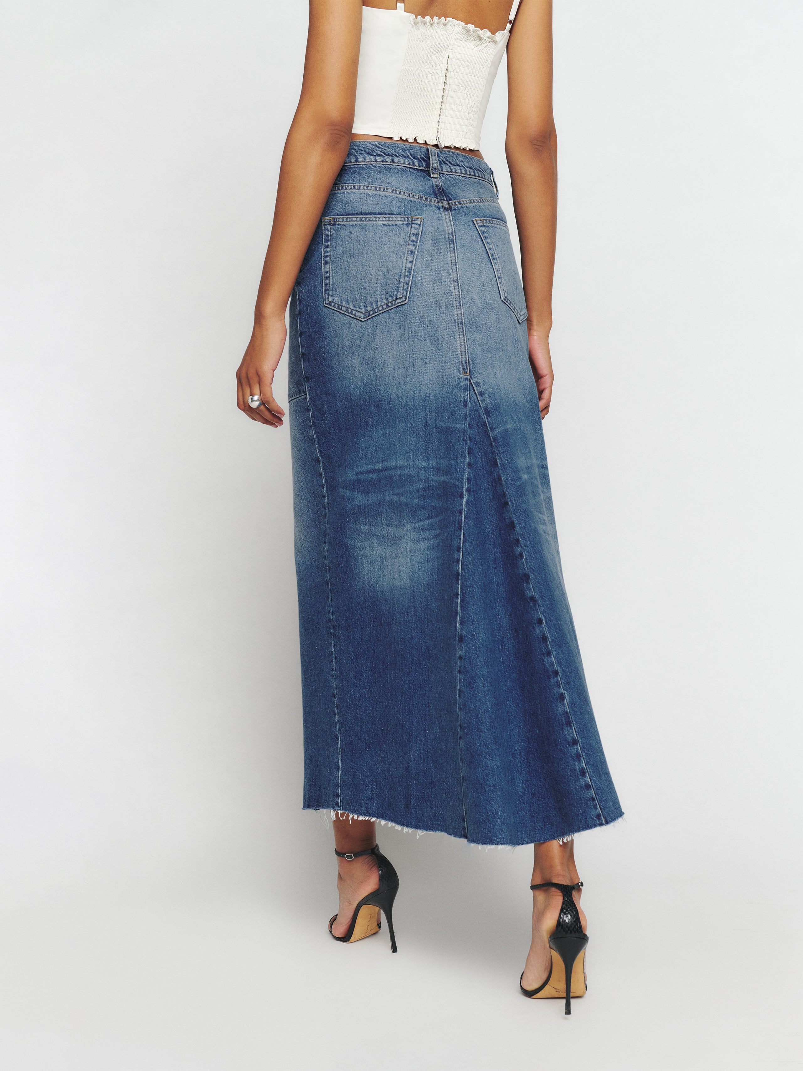 Let your skirt do the talking. Shop the Tazz Maxi Denim Skirt from Reformation, is a long denim skirt with five pockets and a zipper closure.