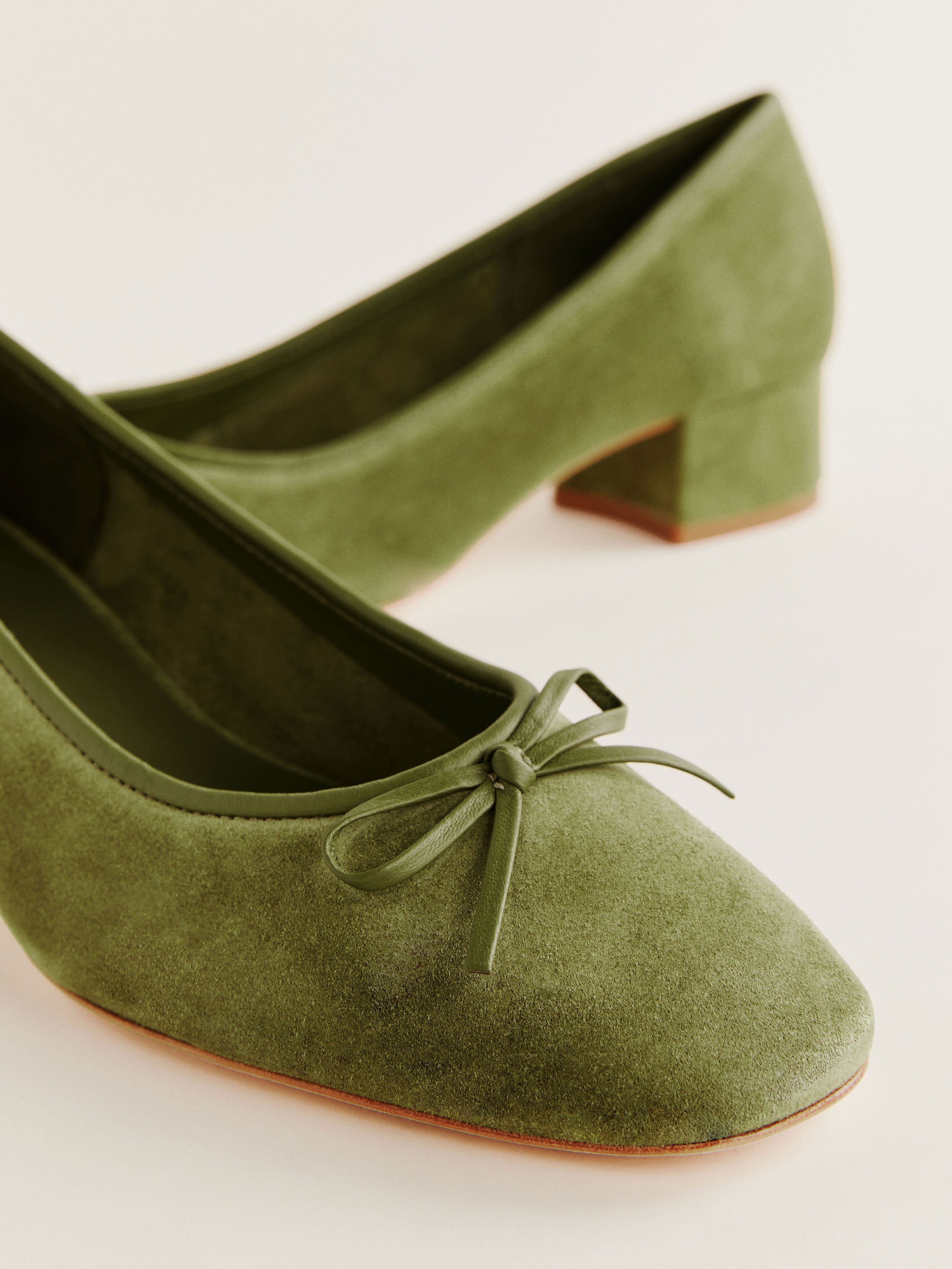 Wear me. Shop the Terry Ballet Pump from Reformation, a heeled ballet pump with a round toe and bow detailing.