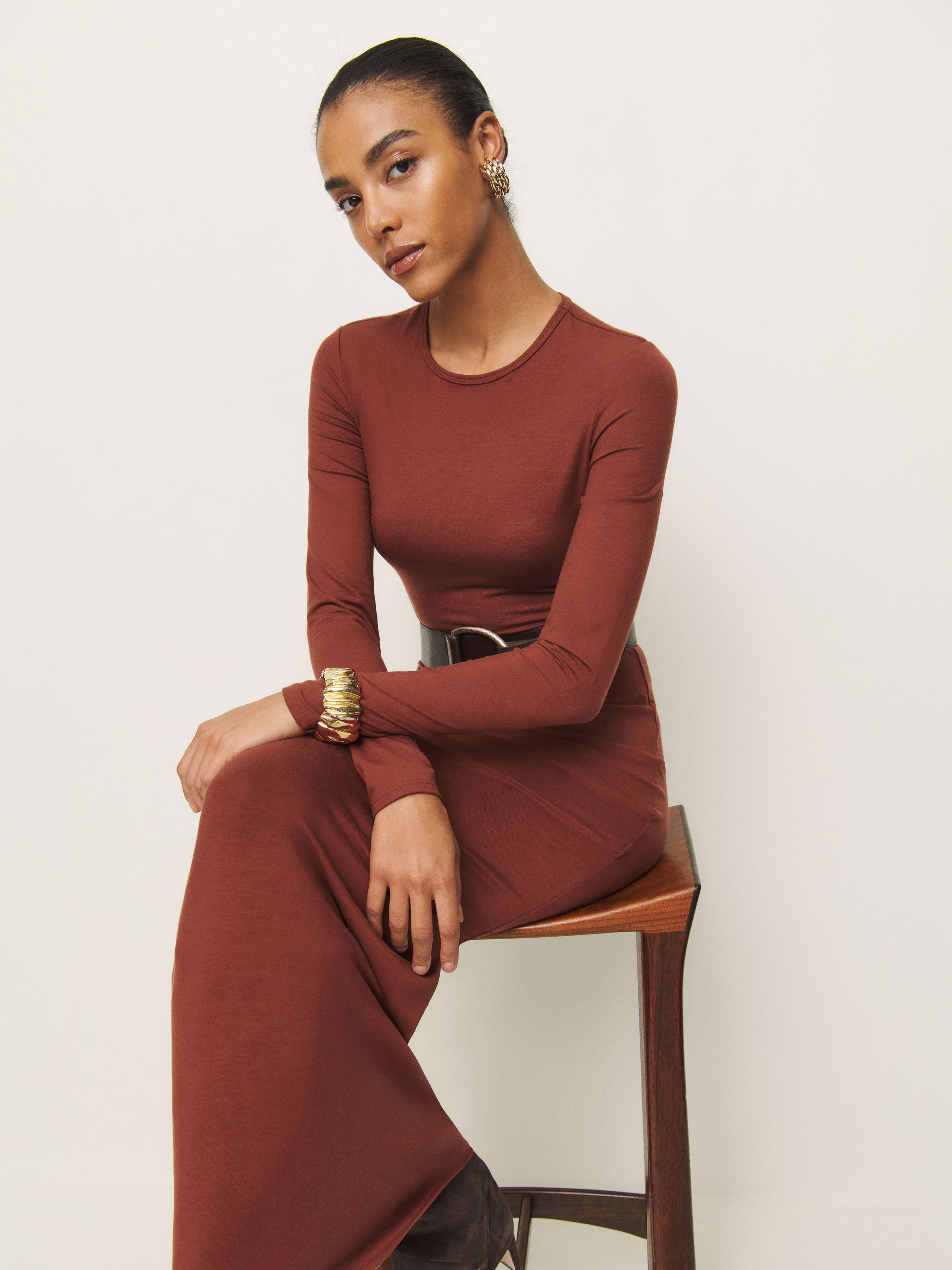 Who, me? Shop the Tommie Knit Dress from Reformation, a long sleeve, midi dress with a crew neckline.