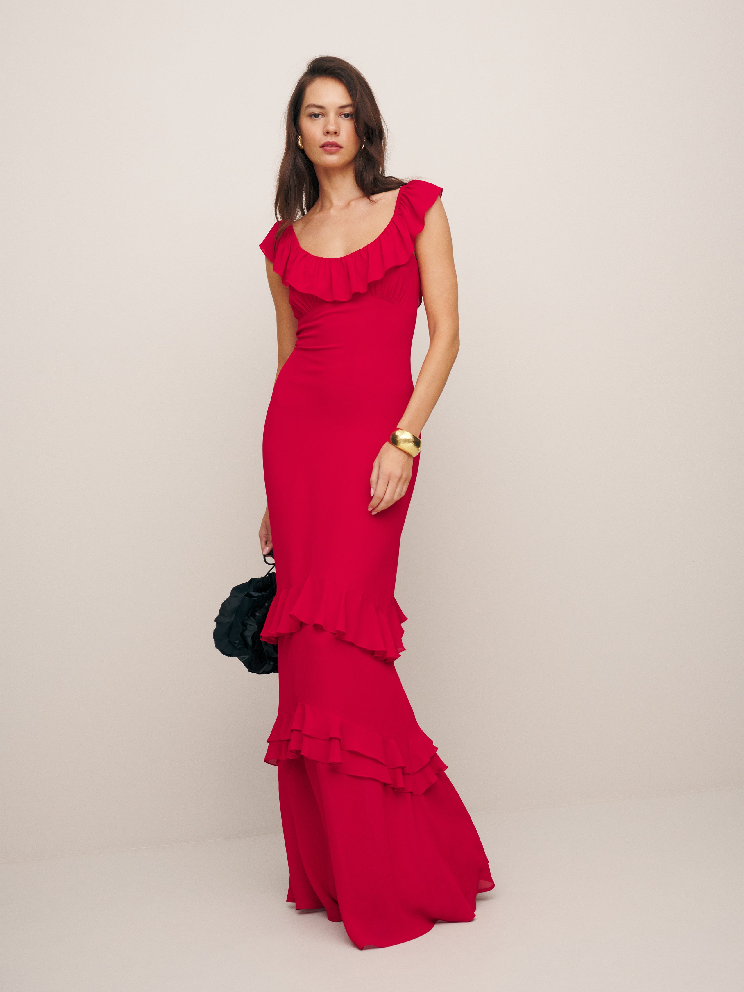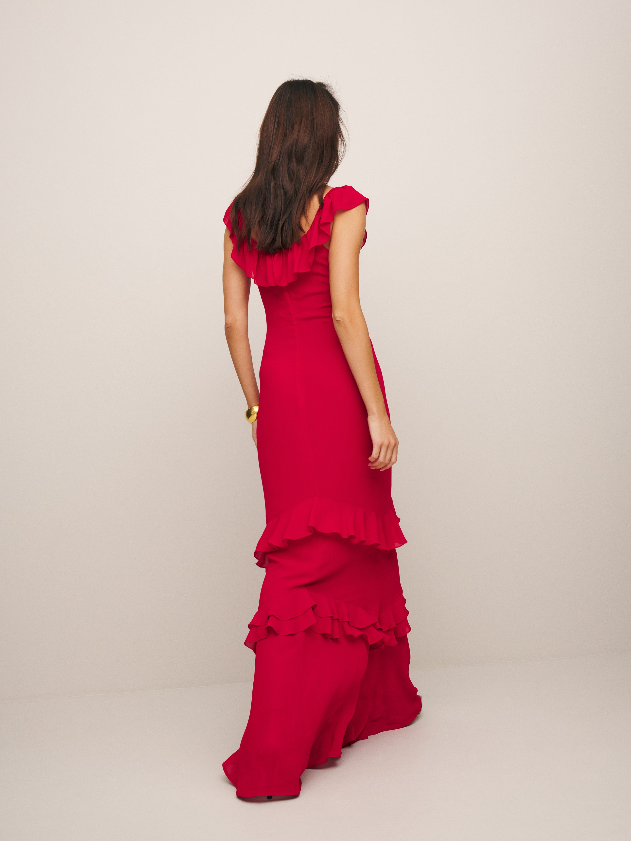 Romance alert. Shop the Tripoli Dress from Reformation, a maxi dress with a scoop neckline, ruffle detailing, and tiered ruffles throughout.