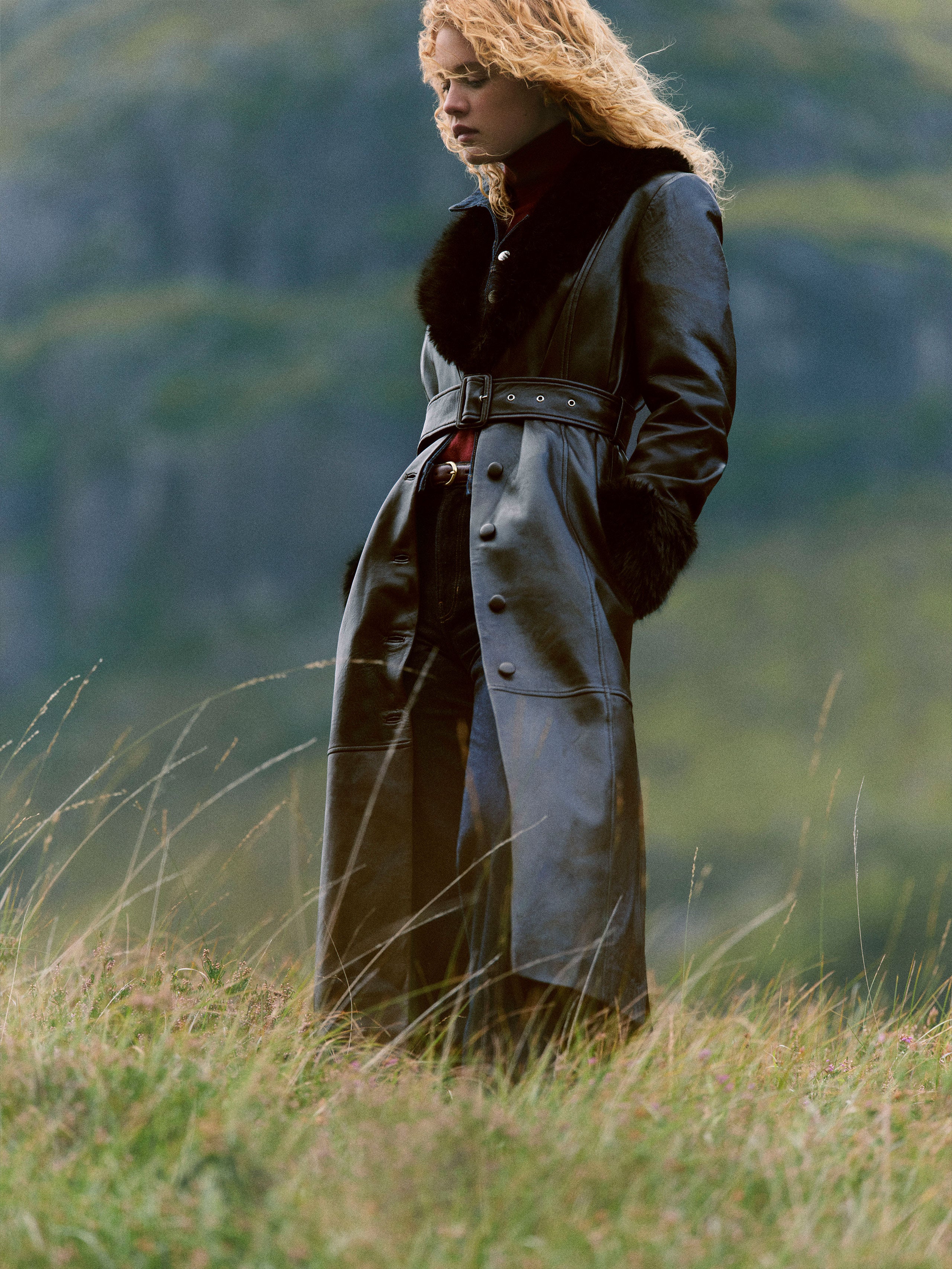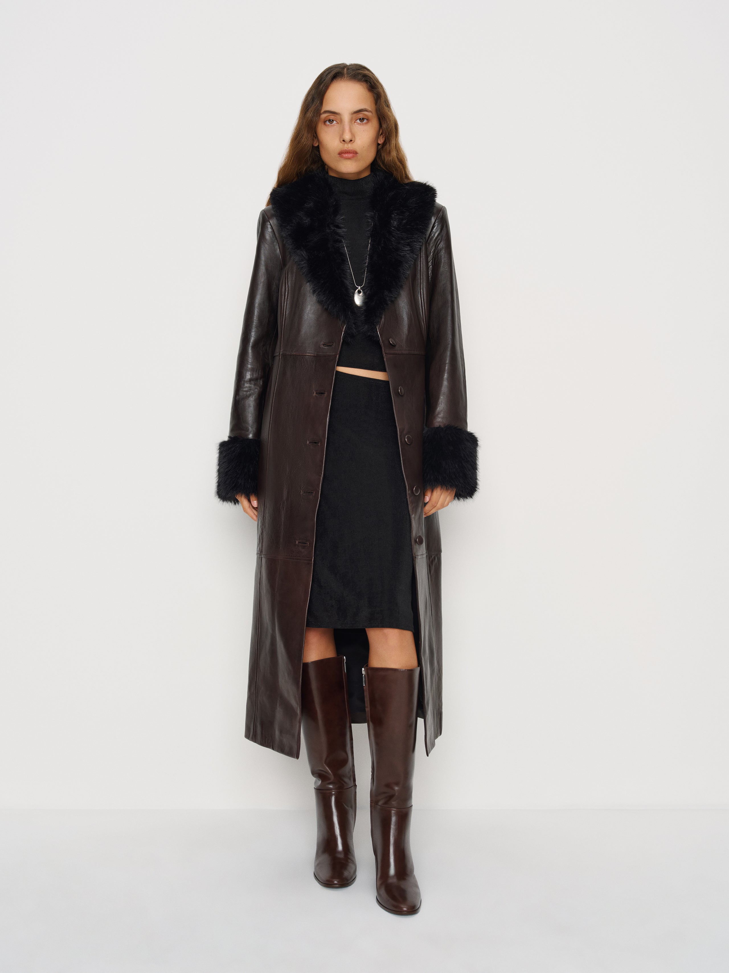 Who, me. Shop the Veda Aria Leather Trench from Reformation, a full-length coat with a fur collar, fur cuffs, and a button front. Will go anywhere with you.