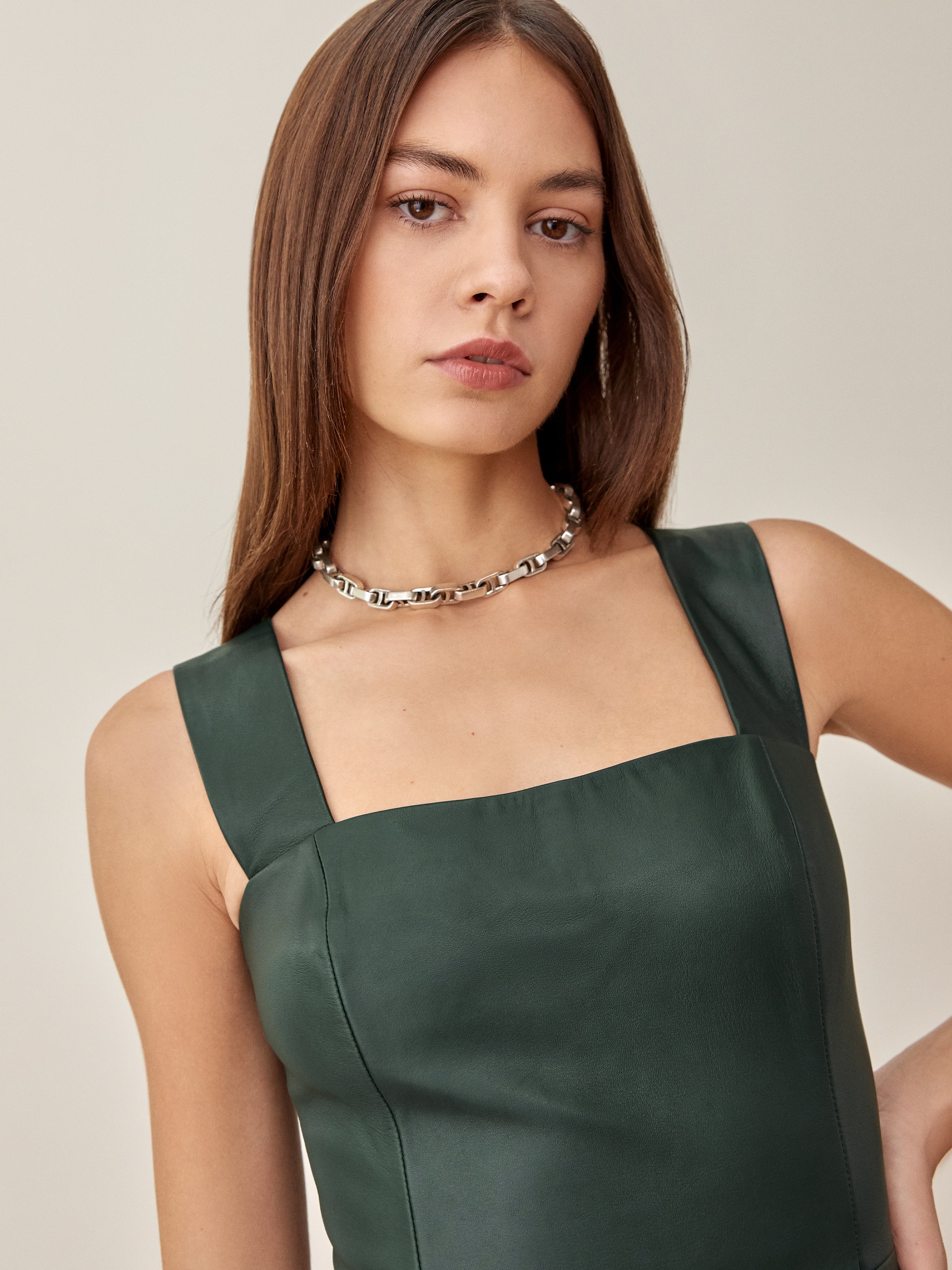 Don't flirt with me. Shop the Veda Austin Leather Mini Dress from Reformation, a sleeveless leather mini dress featuring thick straps and a small side slit.