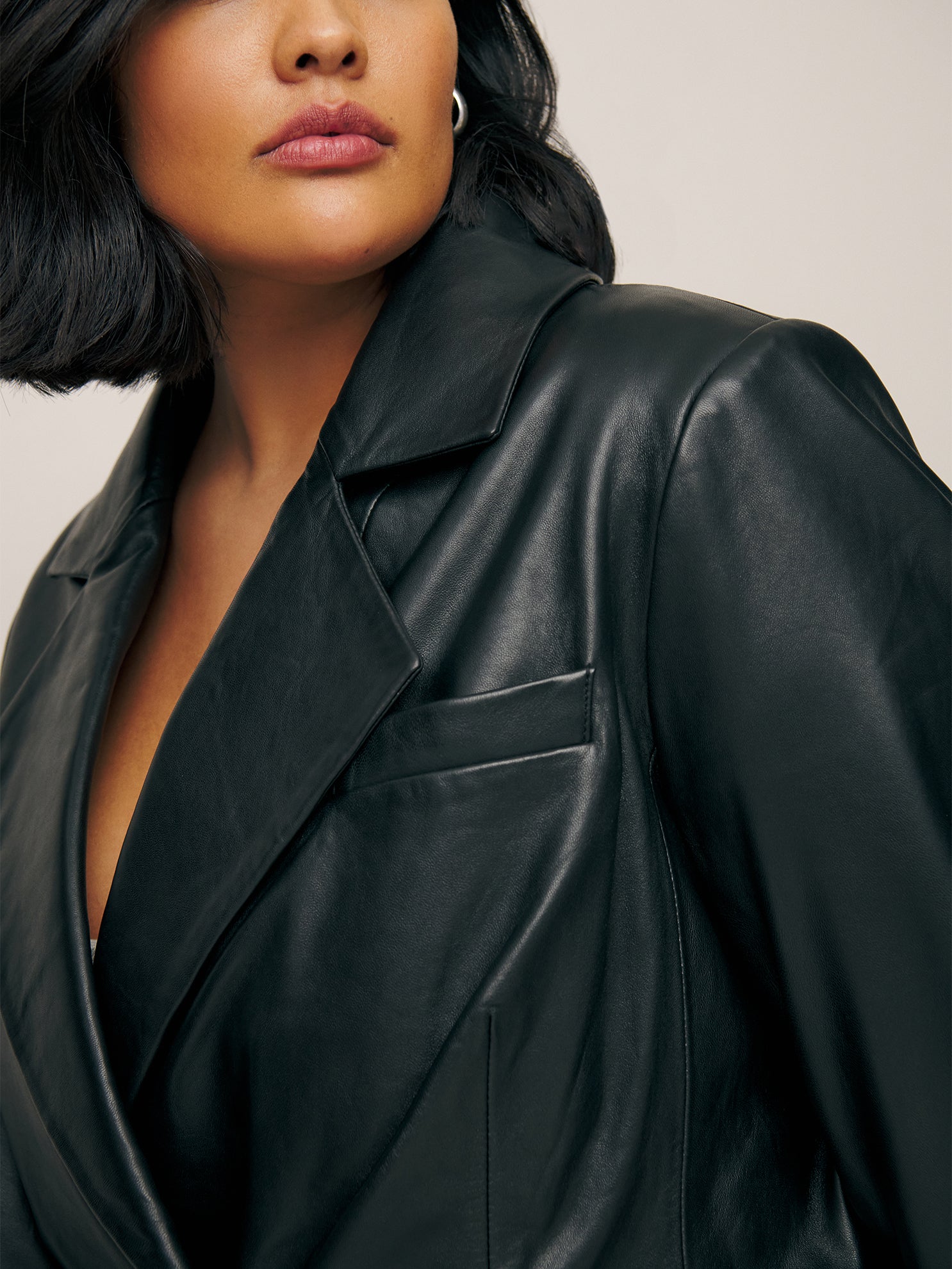 Time to add sleeves. Shop the Veda Dalia Relaxed Leather Blazer ES from Reformation, a relaxed fitting blazer with front pockets and a collared neckline.