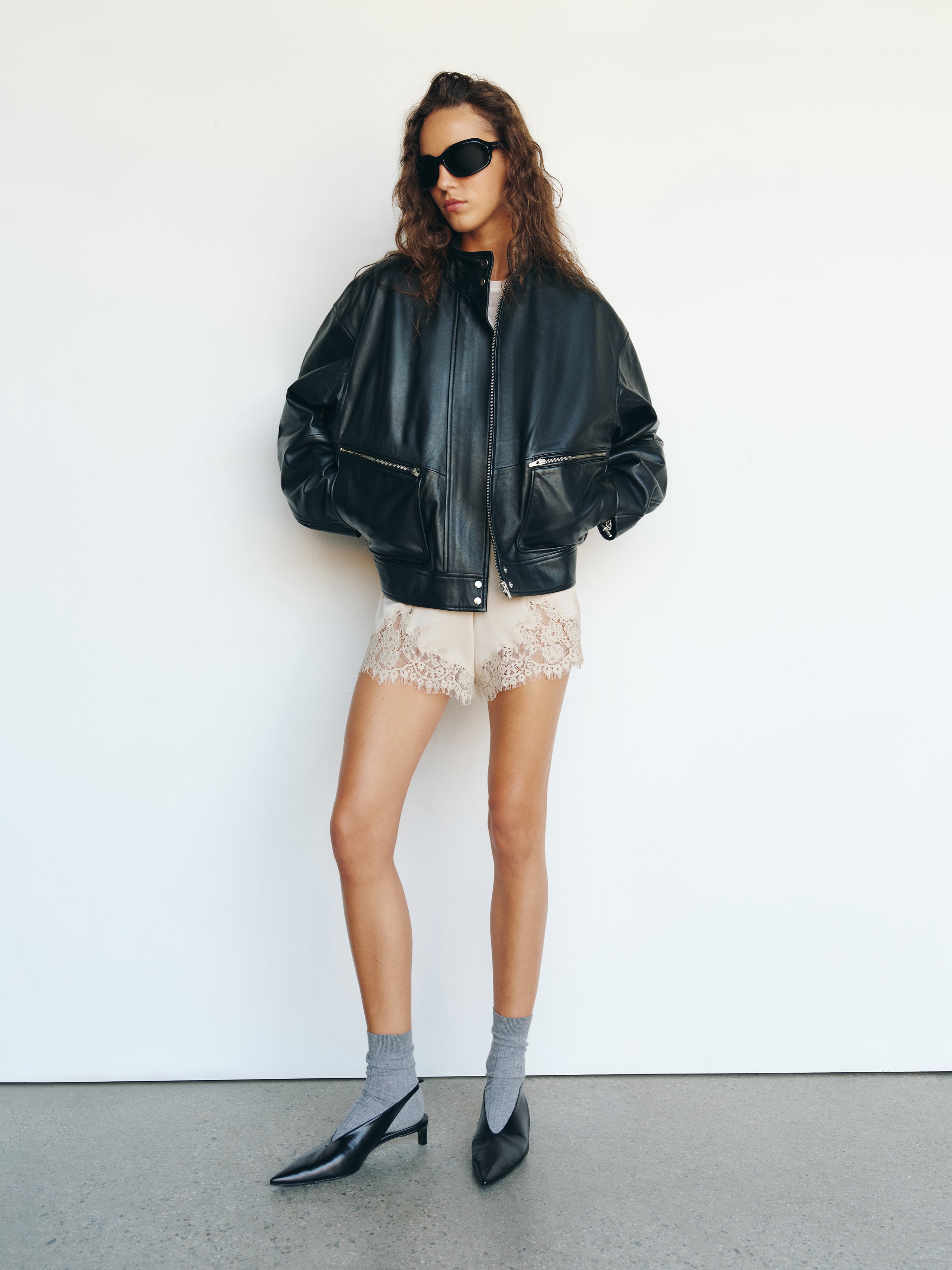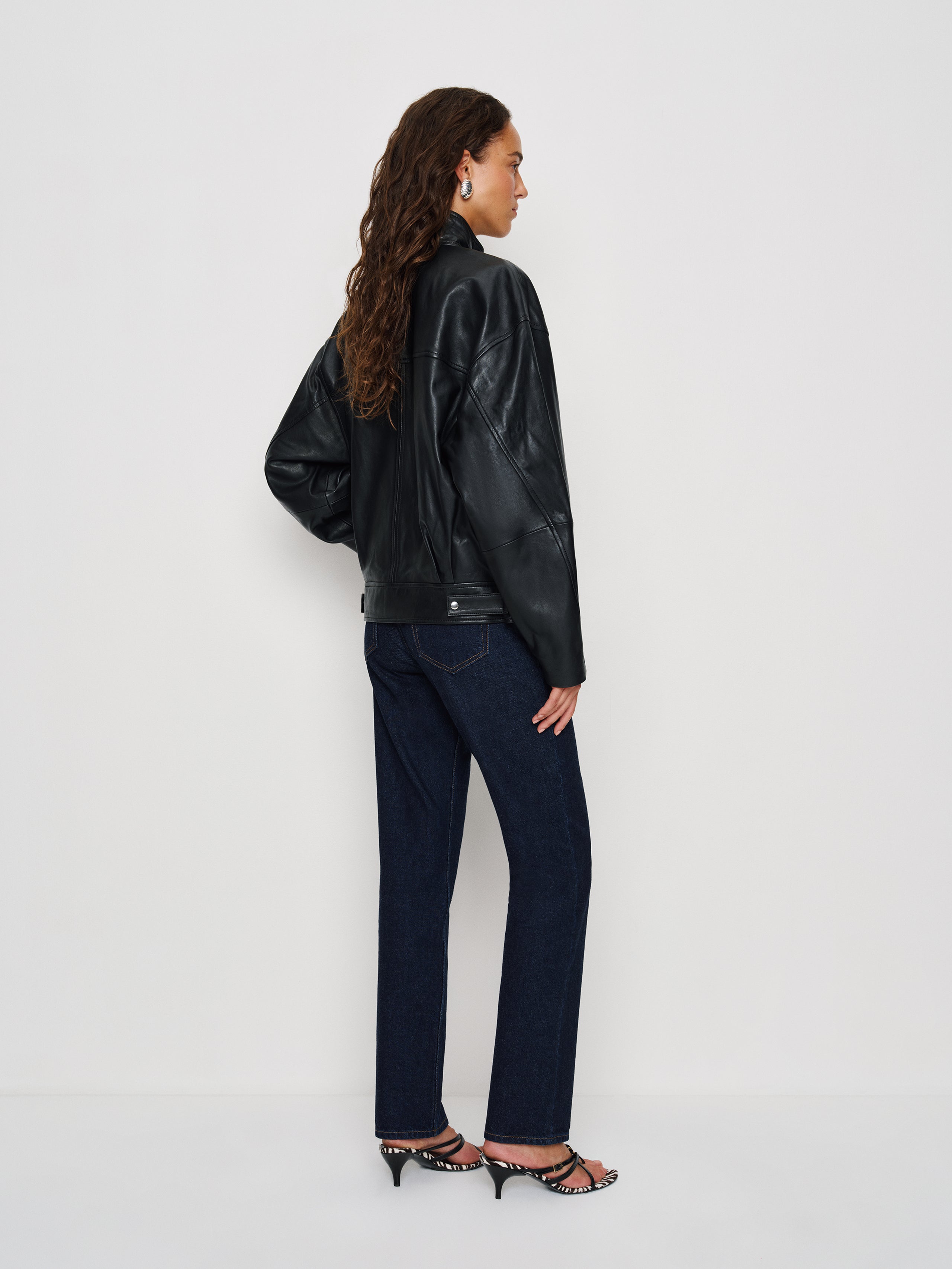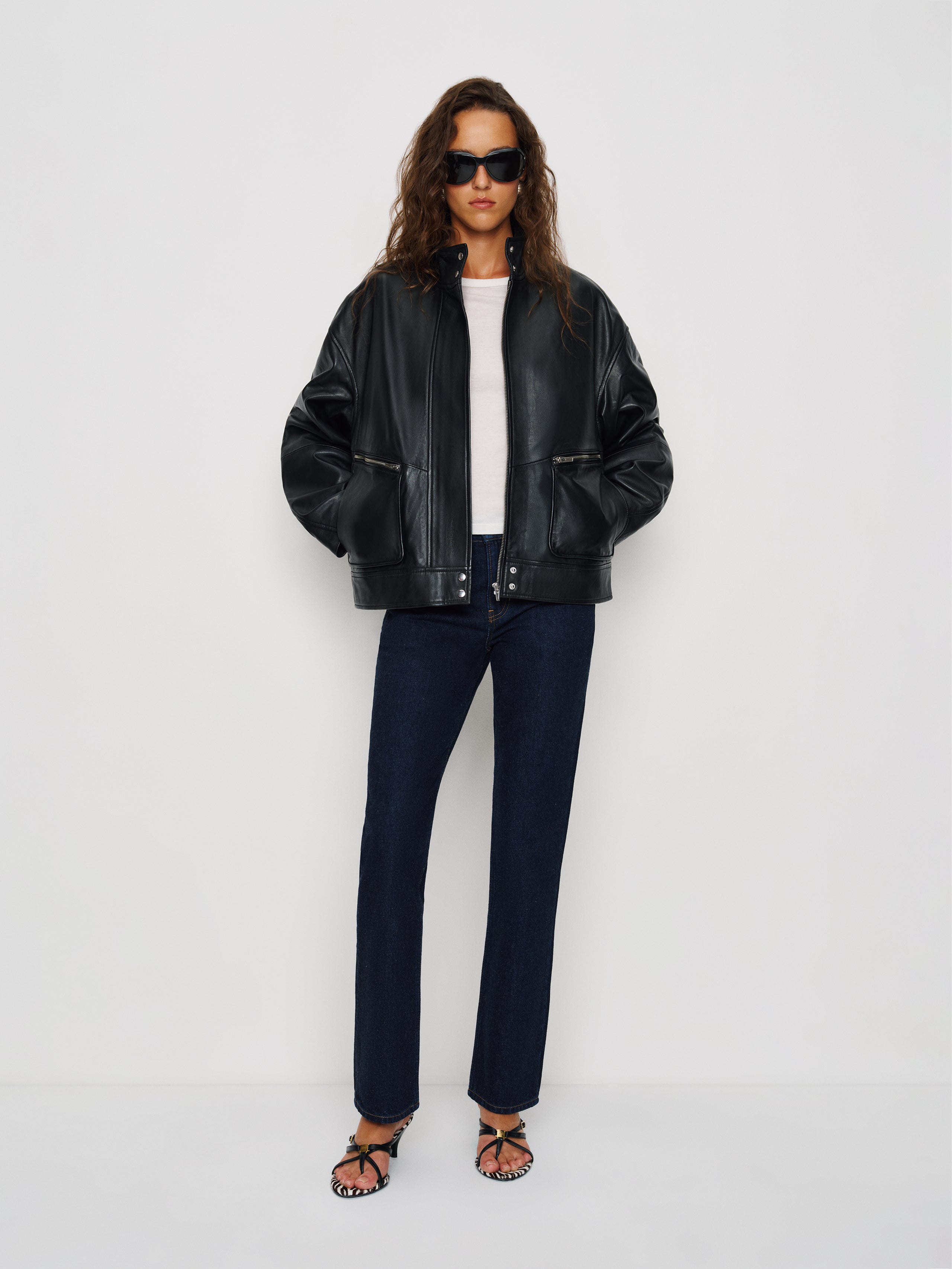 Layer up. Shop the Veda Harrison Leather Oversized Bomber from Reformation, an oversized jacket with a zipper...