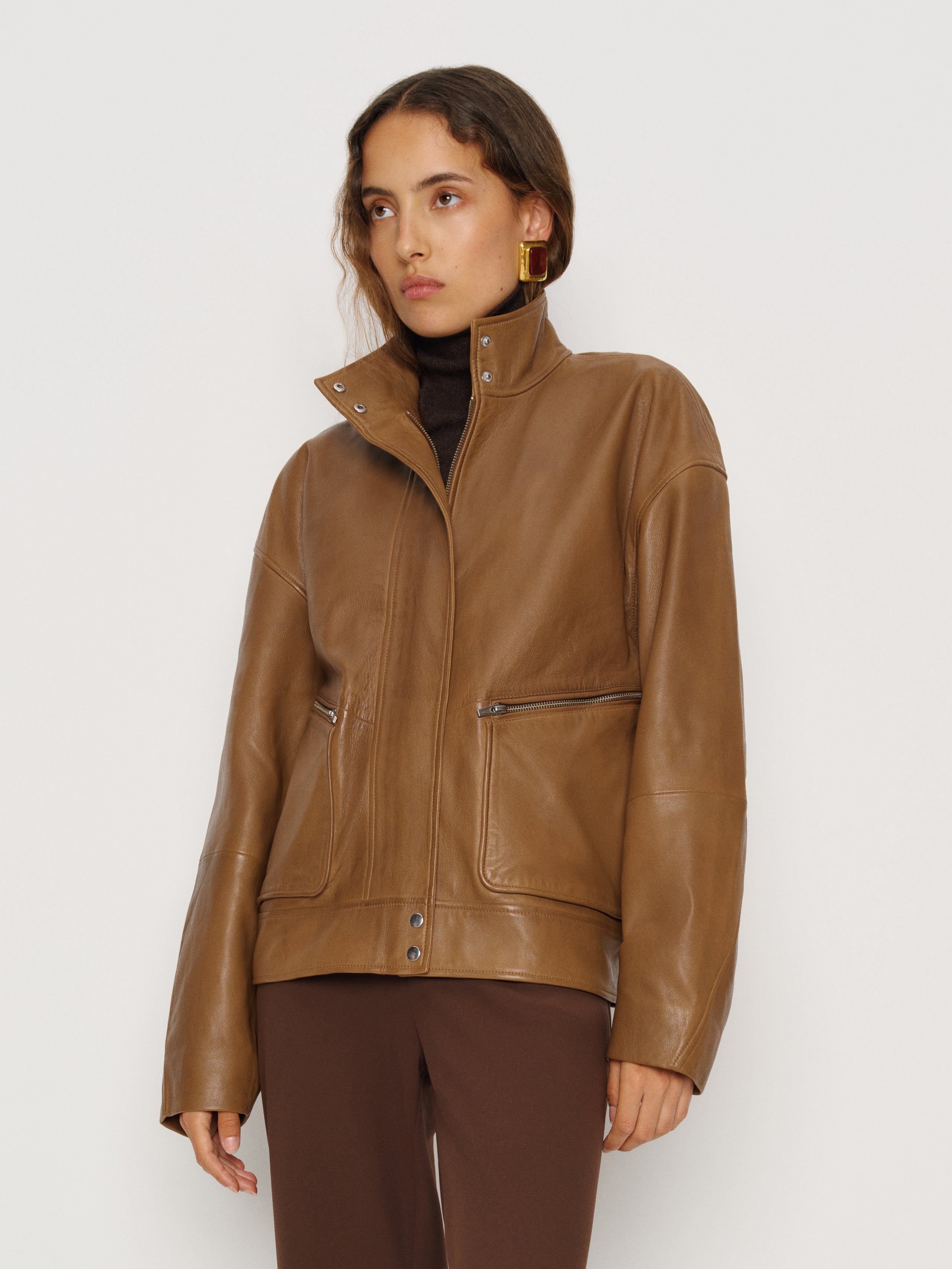 Layer up. Shop the Veda Harrison Leather Oversized Bomber from Reformation, an oversized jacket with a zipper...