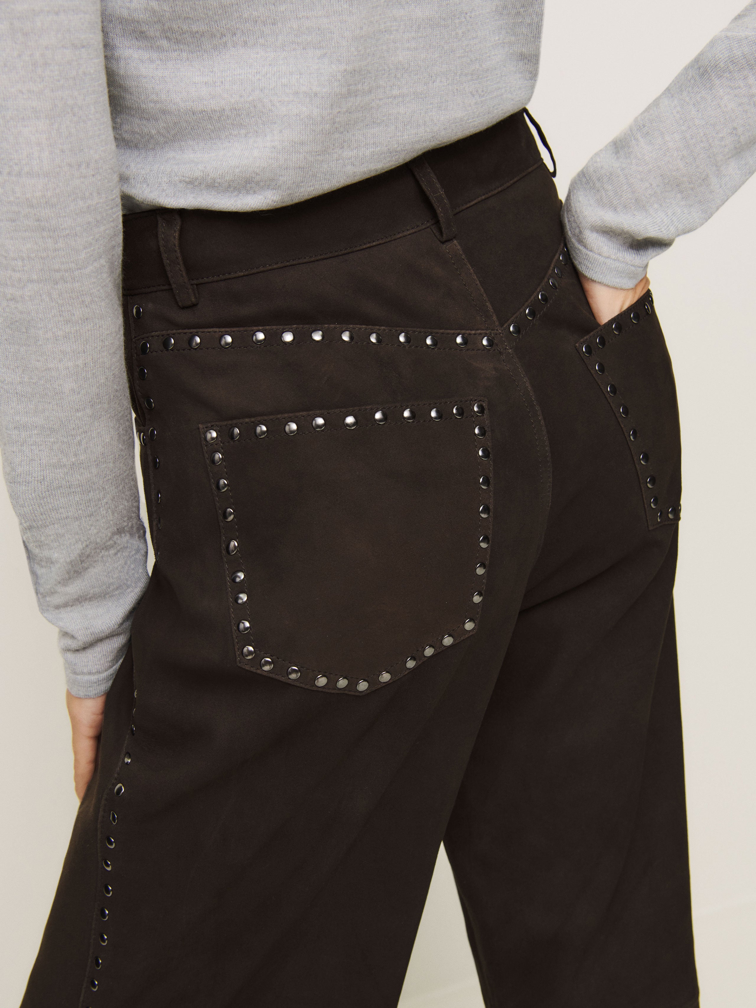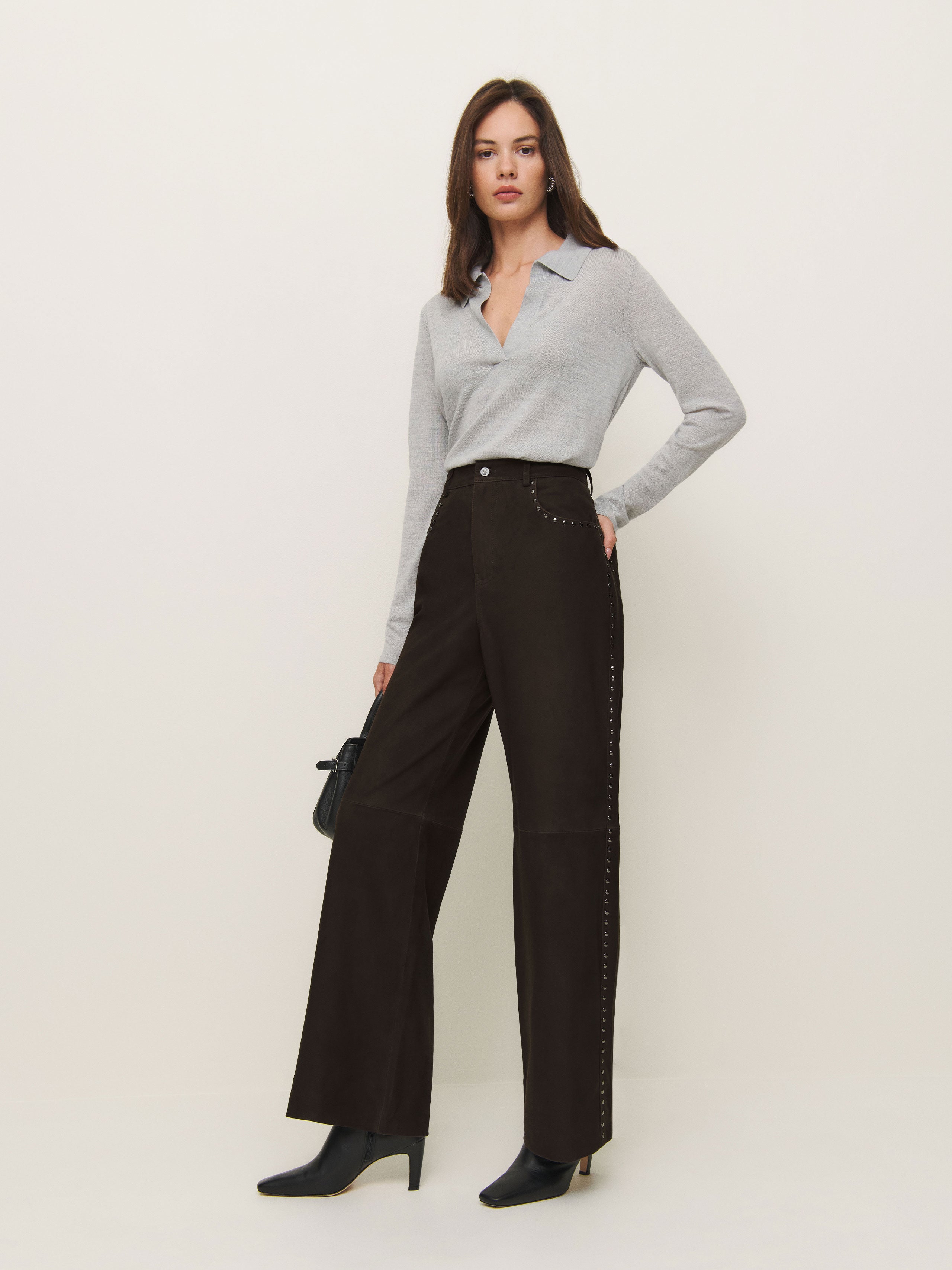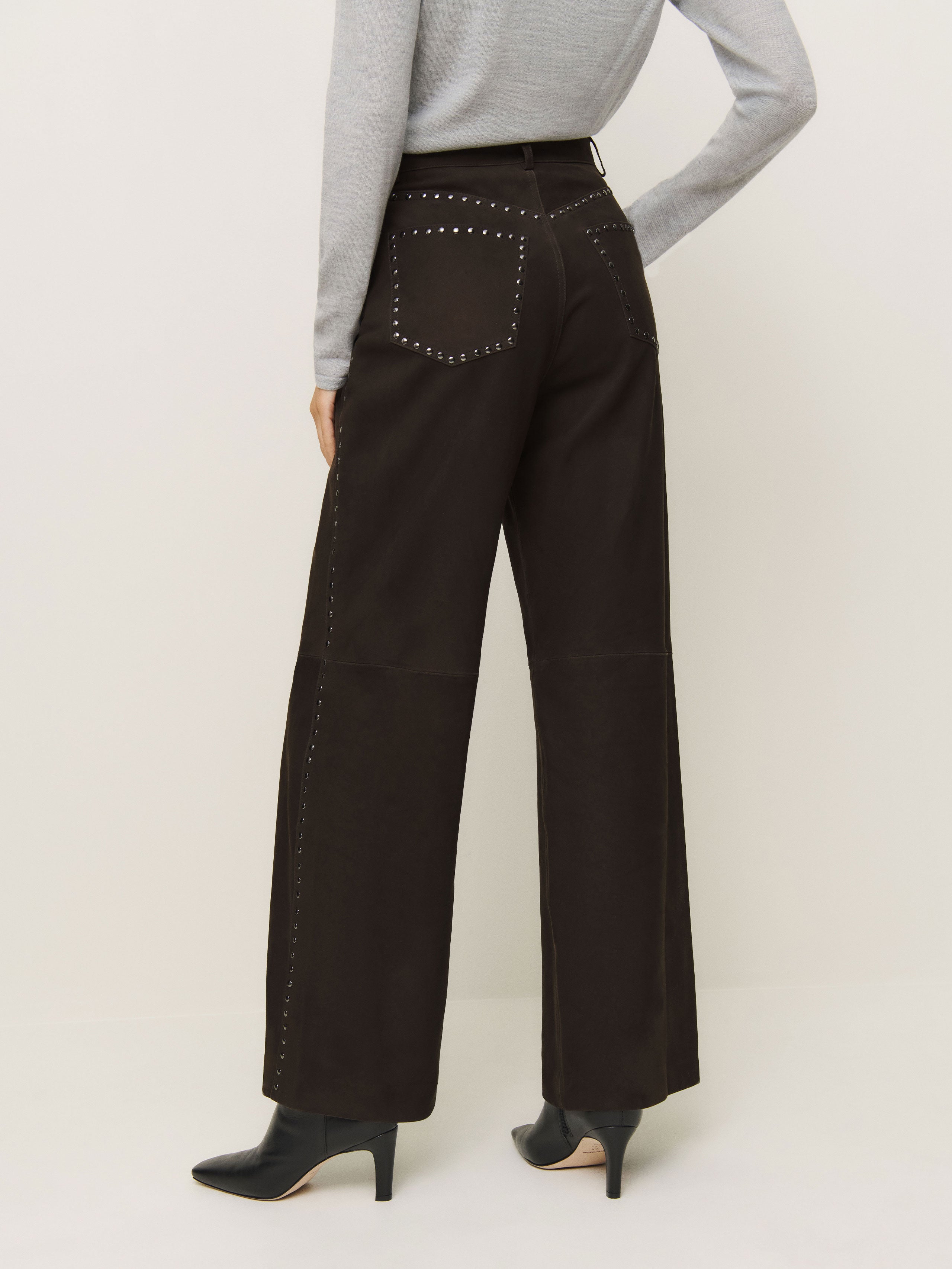 Wear the pants. Shop the Veda Kennedy Studded Leather Pant from Reformation, a high-rise leather pant with a wide leg and studded detailing.