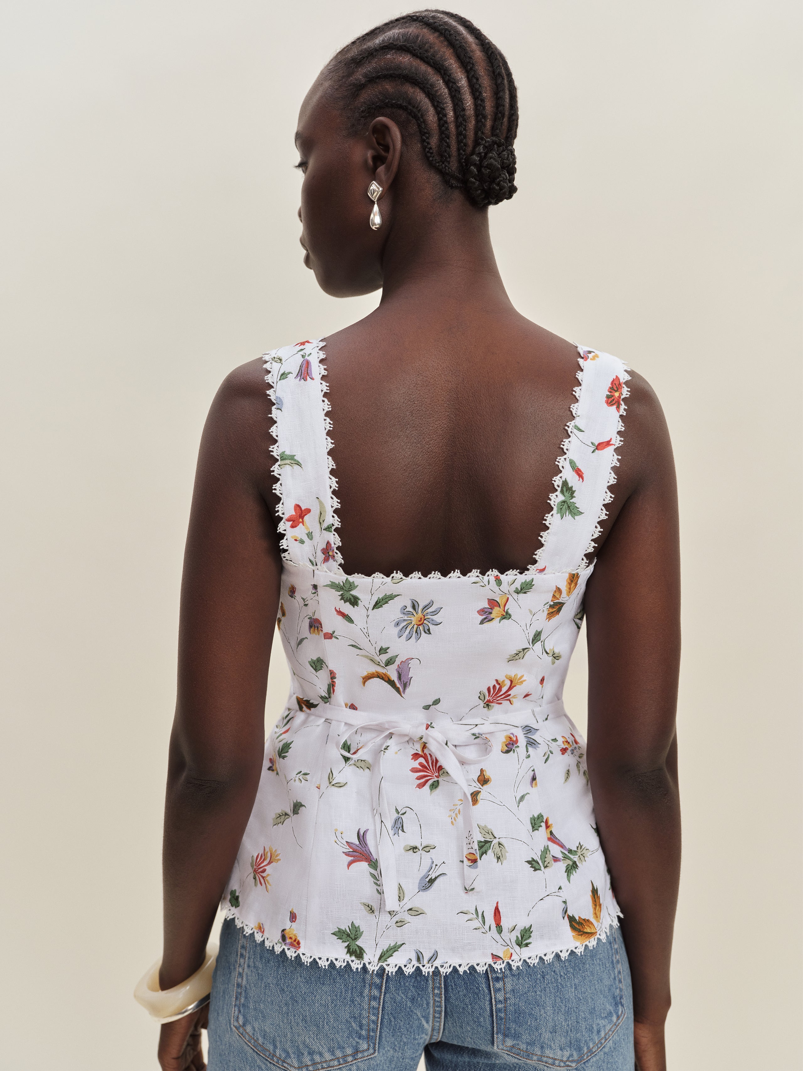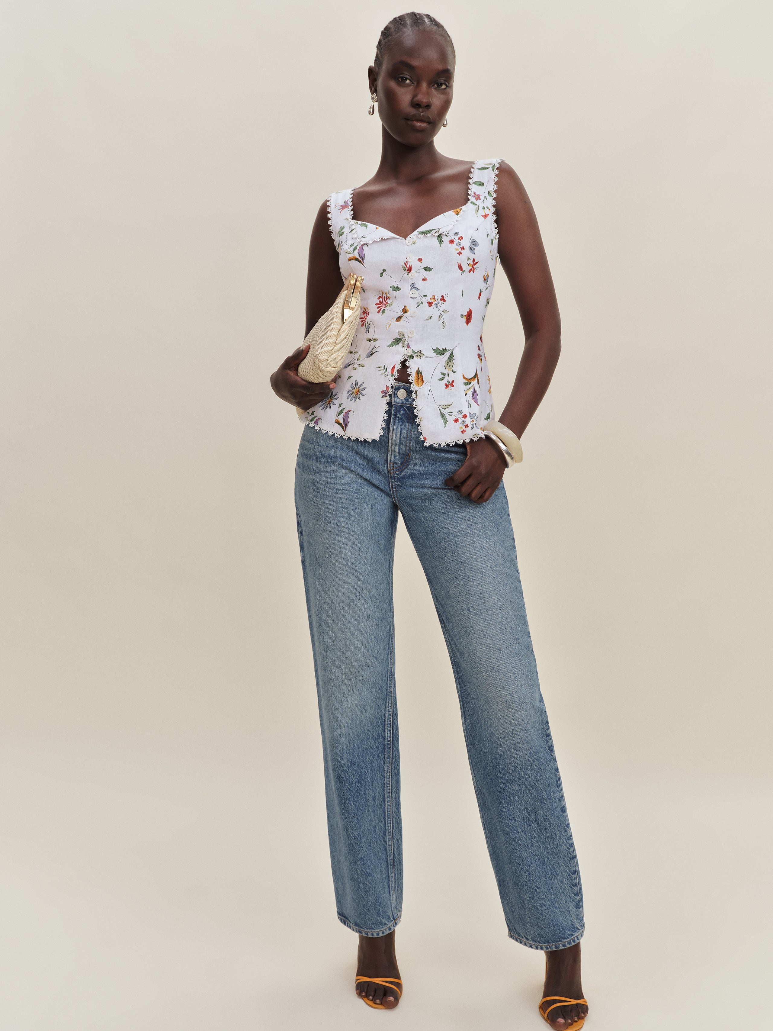 Up top. Shop the Viola Linen Top from Reformation, a sleeveless top with a sweetheart neckline, button...