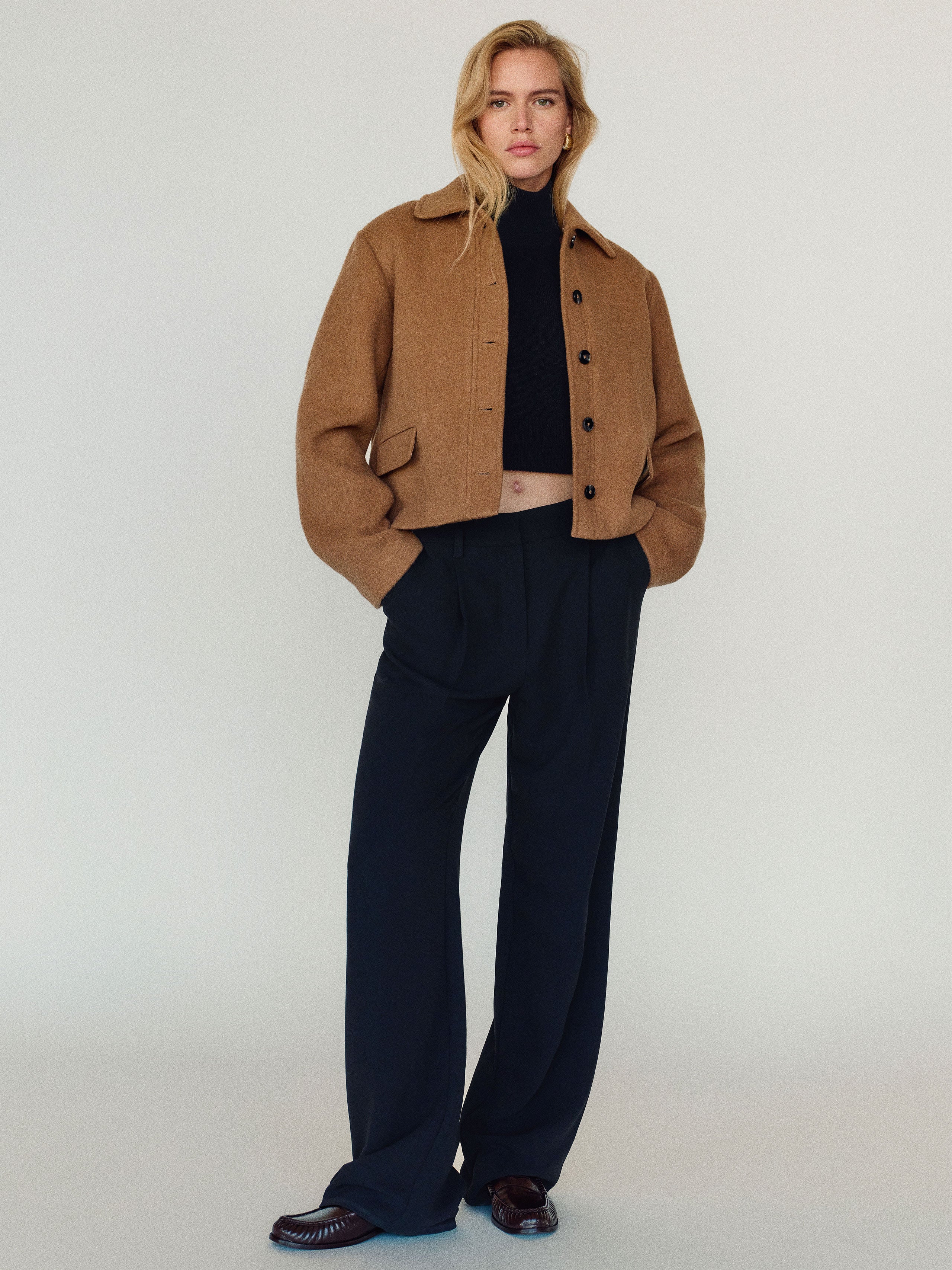 Fall-ready. Shop the Warren Jacket from Reformation, a jacket with a collared neckline and front button closure. We make it easy. Stay warm out there.