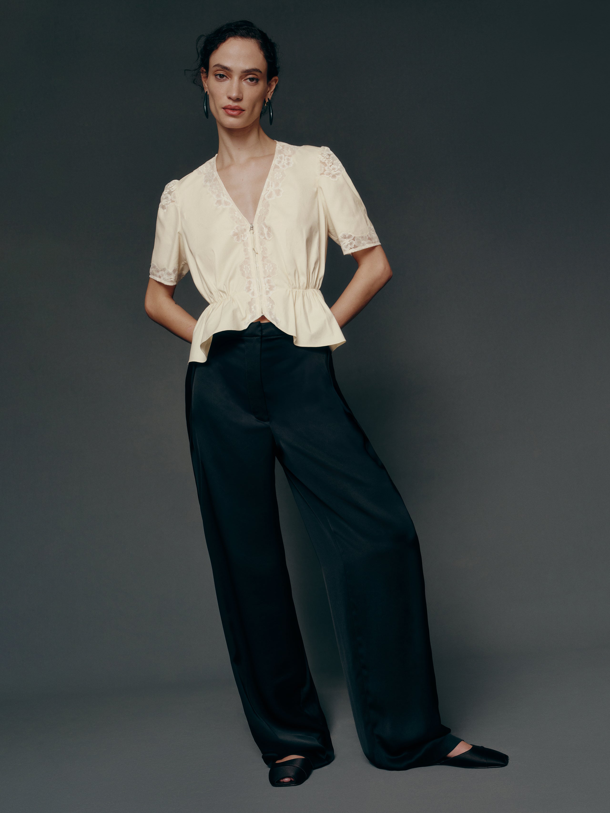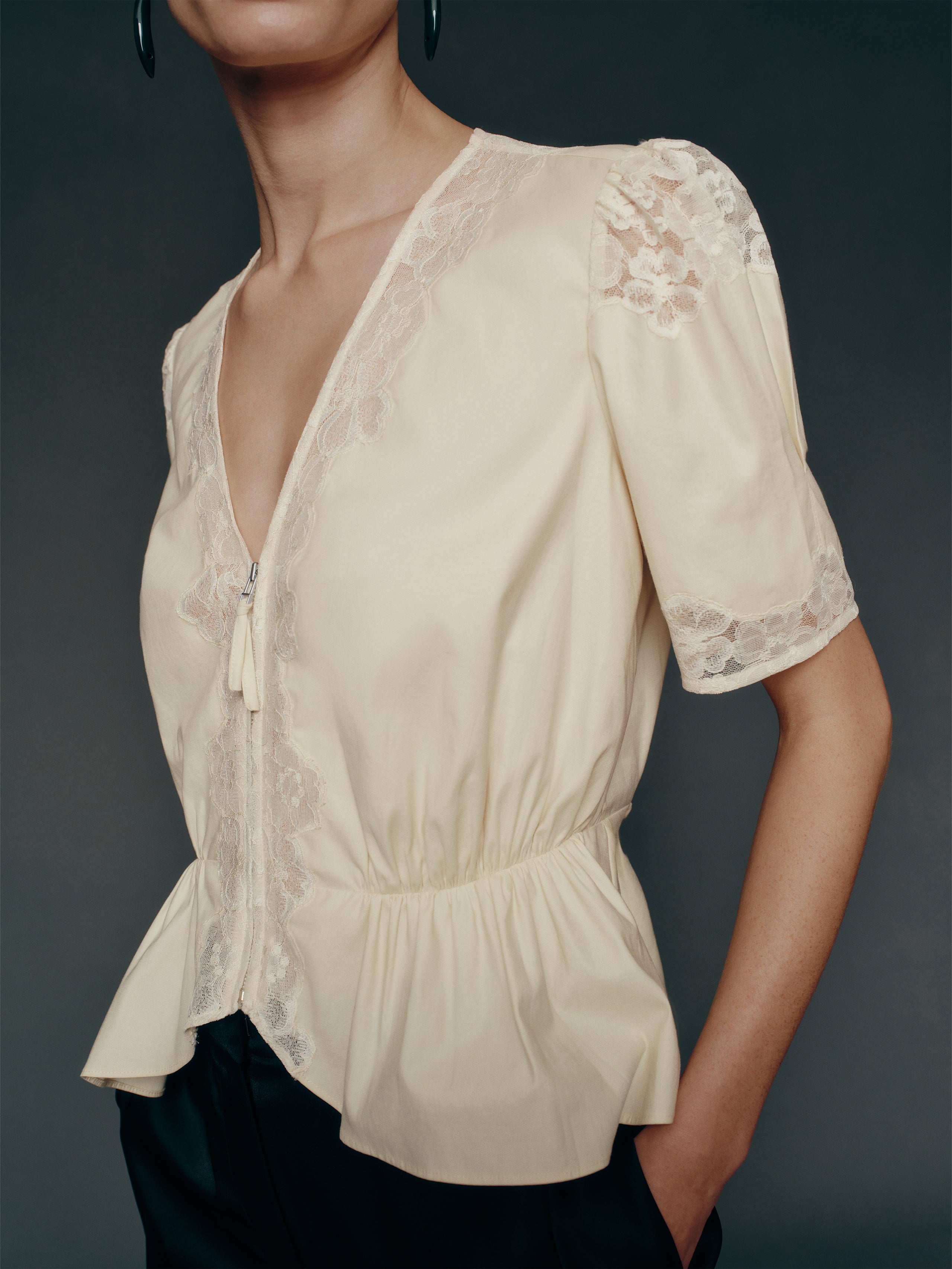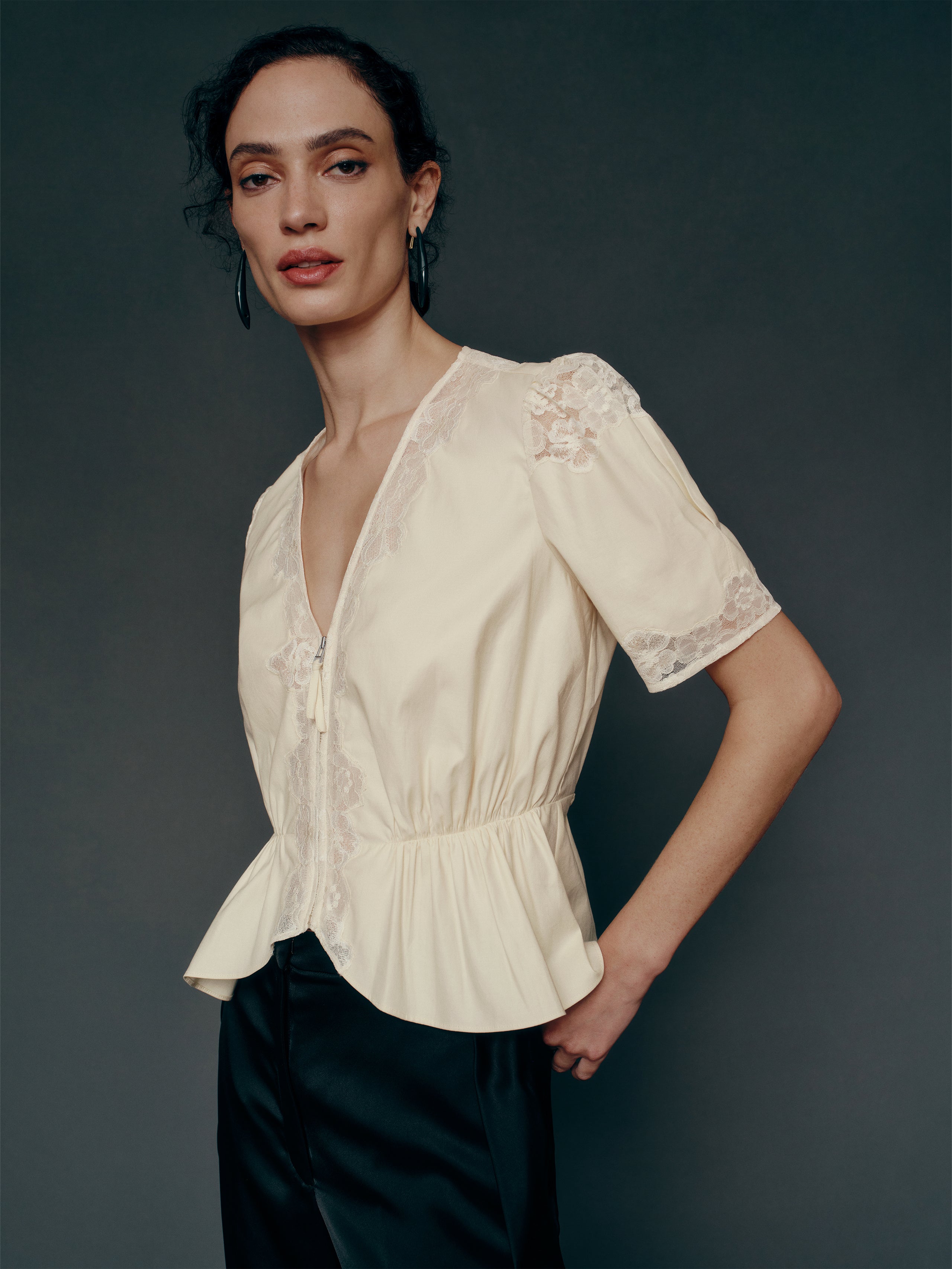Up top. Shop the WAYNE TOP from Reformation, a short-sleeve top with a deep V-neckline, zip front, ruching at the waist, and lace detailing throughout.