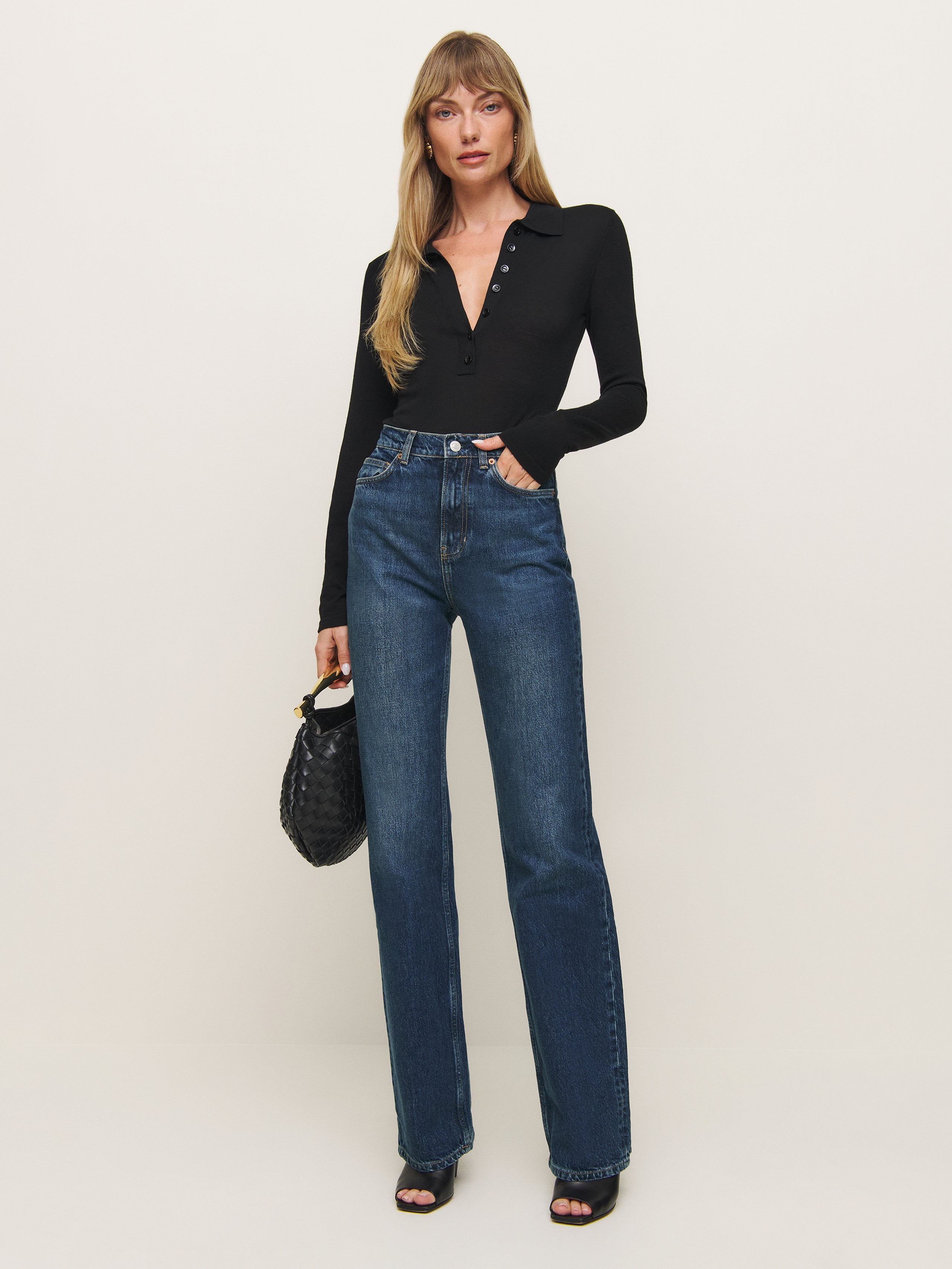 Tell your legs. Shop the Wilder High Rise Wide Jeans from Reformation, a full length jean that is slim throughout the thighs and has a wide leg opening.