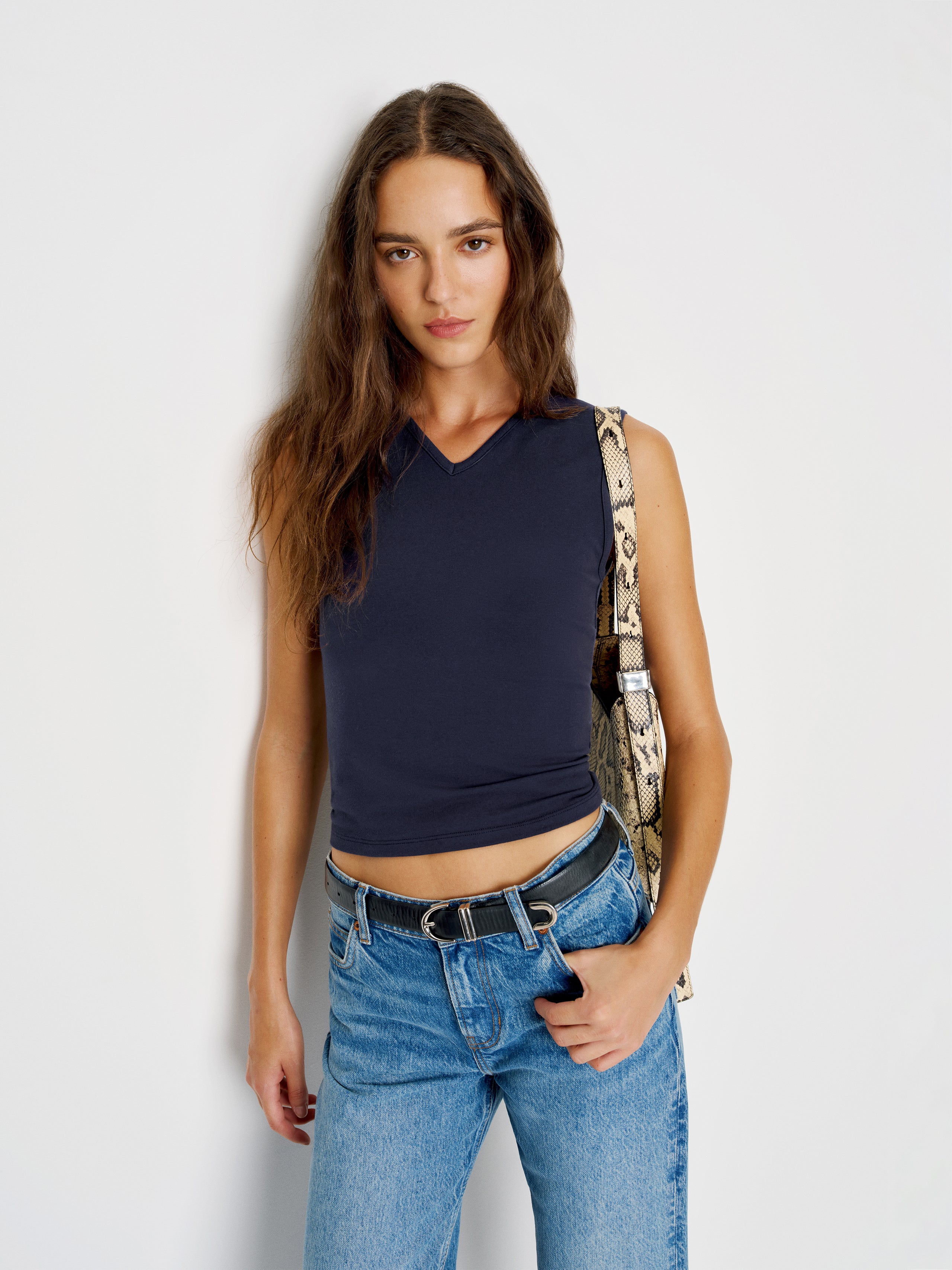 Up top. Shop the Wren Knit Top from Reformation, a sleeveless knit top with a high v-neckline.
